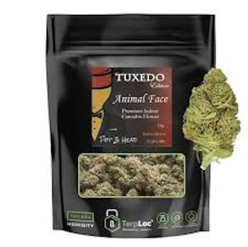 Pot & Head's "Tuxedo Edition" Animal Face is a potent sativa-dominant hybrid (Face Off OG x Animal Mints) known for its dense, mossy green buds with dark orange hairs and a heavy coating of trichomes. It delivers sharp gassy, sweet cookie dough, and pine flavors with high-THC, long-lasting, and uplifting effects.